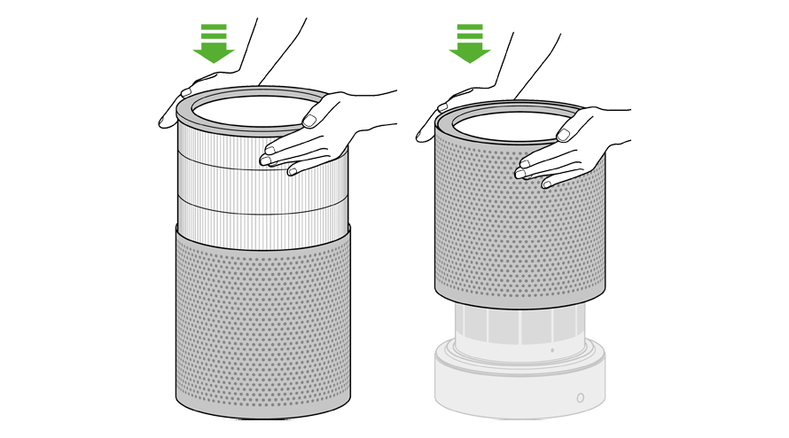 Desliza el filtro en el compartimento y luego la unidad completa en el cuerpo del purificador.
