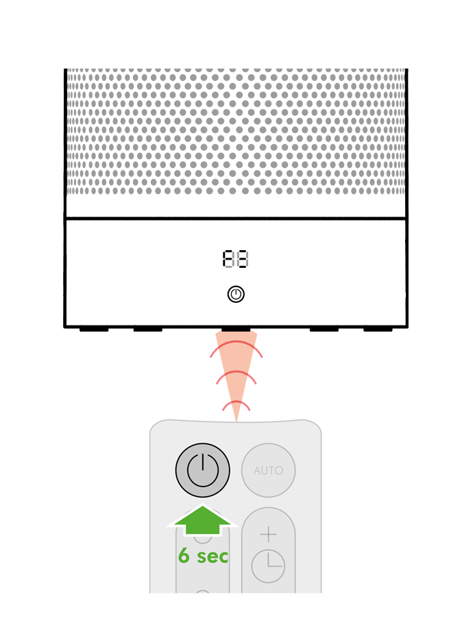 Cuando hayas reensamblado tu purificador, presiona y sostén el botón de "Modo de espera ENCENDIDO/APAGADO" durante 6 segundos en el control remoto.